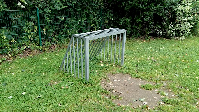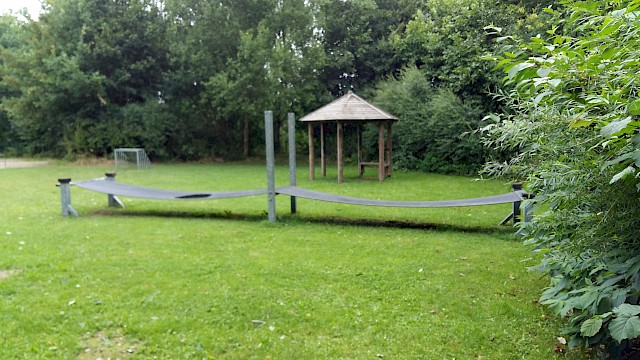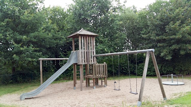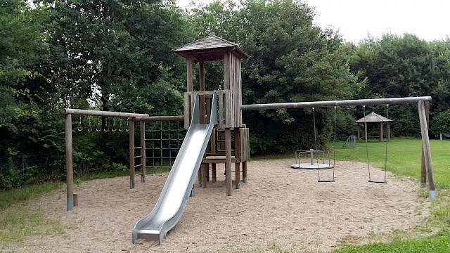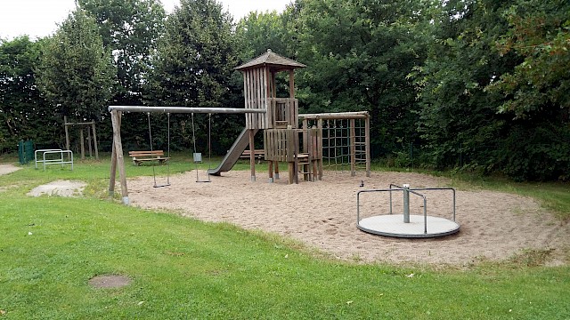 Ein Klettergerüst mit Turm und Rutsche, Schaukeln, ein Häuschen, Wipptiere und eine Sprungmatte laden zum Toben ein. Auf dem Platz mit zwei kleinen Toren kann gebolzt werden. Dieser Spielplatz ist umzäunt und kann durch ein Törchen verschlossen werden.