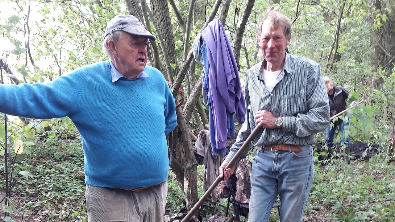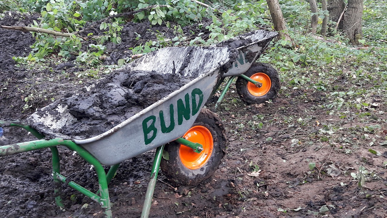 Am 24. September traf sich ein gutes Dutzend Aktive, die diesem Problem Abhilfe schaffen wollten. In einer mehrstündigen Arbeitsaktion wurden Teich und Teichzufluss vom Schlamm befreit, so dass der Teich heute auch wieder Wasser enthält, nicht unwichtig für die dort zahlreichen Amphibien. Der Schlamm wurde großflächig auf dem anliegenden Gelände verteilt und dürfte demnächst wieder bewachsen sein. Nebenbei: Was es heißt, Schlamm in einer Karre auf unebenem Gelände zu transportieren, weiß nur derjenige, der es mal gemacht hat!