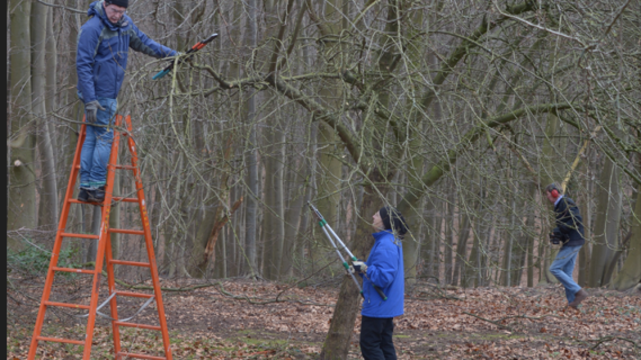 Nachdem bereits Ende September die sehr arbeitsaufwendige Entschlammungsaktion auf der Schweineweide durchgeführt worden war, war Ende Februar die Streuobstwiese Ecke Feldkamp / Dänenweg an der Reihe. Auf der kleinen Wiese am Dalbekrand wurden in den 90er Jahren auf Anregung des damaligen Umweltausschusses Obstbäume gepflanzt, deren Pflege aber in Vergessenheit geriet (sie wurden in den letzten Jahrzehnten nur ein- oder zweimal beschnitten), so dass die Wiese und die Bäume immer mehr verwilderten. Hinzu kam die Ablagerung von Gartenabfällen durch Anwohner, die inzwischen eine dichte Buschhecke an zwei Seiten der Wiese bilden. Diese Büsche haben wir bewusst stehen gelassen, sie sind ein ideales Nist- und Rückzugsgebiet für Vögel und andere Kleintiere.